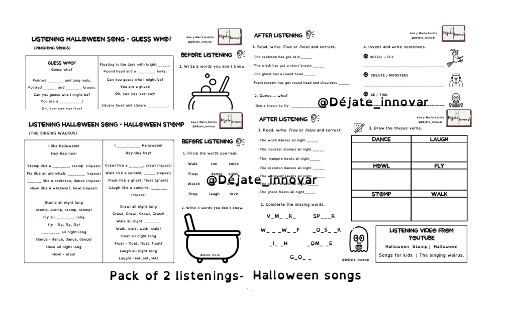 Pack de dos listenings para Halloween con 2 canciones de Youtube. Cada listening incluye actividades cortas para antes y después de la escucha. Algunas de las actividades tipo: