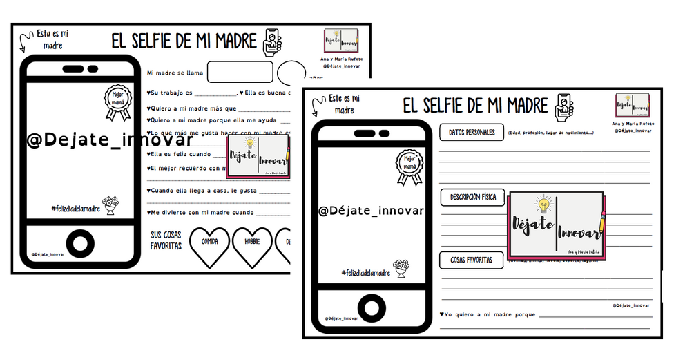 Actividad para trabajar el día de la madre con el fin de que los alumnos creen el selfie de su madre y a su vez hablen sobre momentos divertidos, virtudes, cómo es, a qué se dedica, qué le gusta, sus cosas favoritas, etc. La versión tiene 3 modelos distintos atendiendo a dos niveles: un modelo para 1ºy 2º de primaria y otras dos para alumnos a partir de 3º con un modelo de expresión escrita más libre.