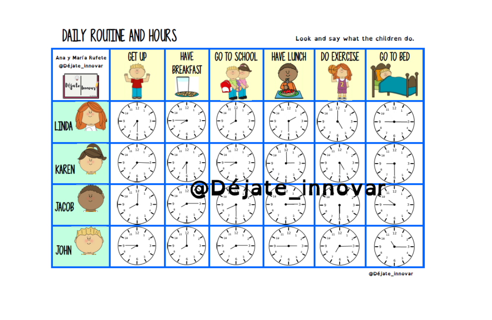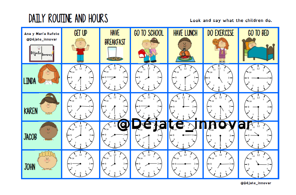 -Vocabulario de Daily routine... a partir de verbos como get up, have breakfast, go to school,go to bed...